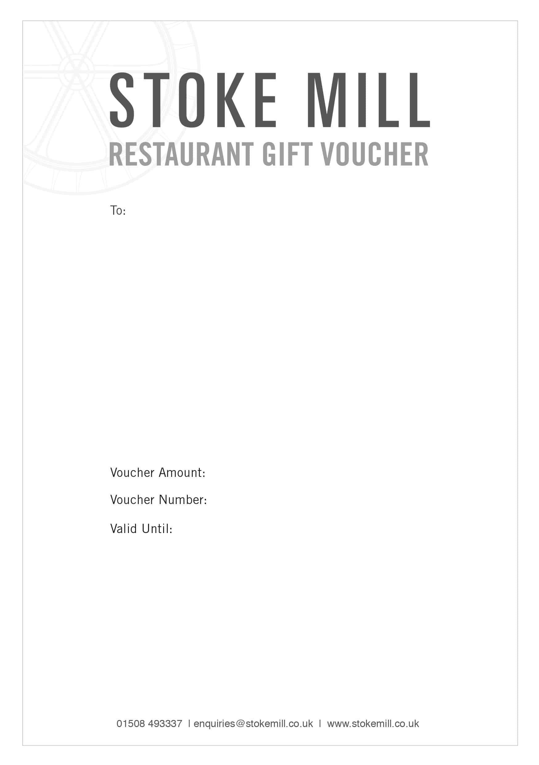 Choose from £30, £40, £50, £75, £100, £150, £220, £250 and £400 Gift Vouchers that can be redeemed towards a meal in STOKE MILL